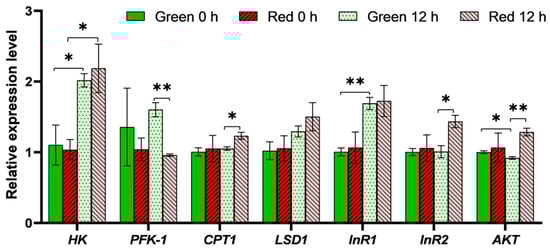 Expression of selected insulin and metabolic genes in red and green adult aphids before and after crowding treatment. Student’s t-test, n = 3, * p < 0.05, ** p < 0.01. Pairwise comparisons between aphid color or treatment time without asterisks were not significantly different. Data are shown as mean ± SEM. Abbreviations: HK: hexokinase; PFK-1: phosphofructokinase-1; CPT1: carnitine O-palmitoyltransferase 1; LSD1: lipid storage droplet protein 1; InR1: insulin receptor 1; InR2: insulin receptor 2; AKT: protein kinase B.