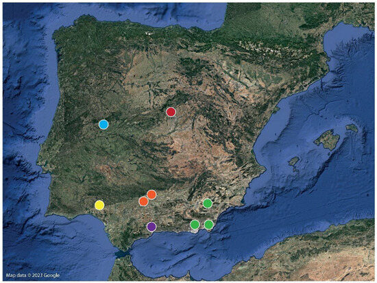 Areas where samples were collected. Blue, orange, yellow, red and purple dots (Cáceres, Córdoba, Huelva, Madrid and Málaga, respectively) indicate the collecting localities for G. dorsalis. Green dots (Almería) indicate the area where individuals of the new species Gluvia brunnea sp. nov. were collected.