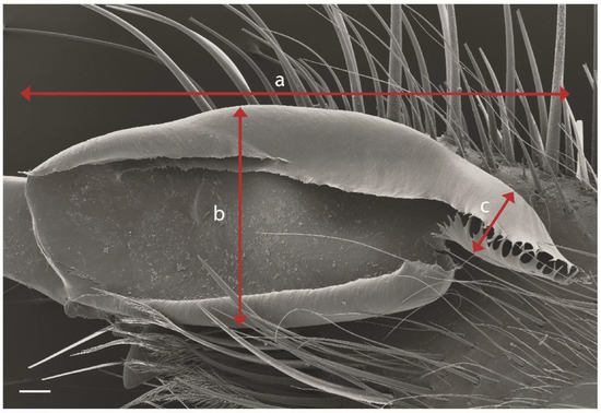 The morphological description of the present work follows the directions of previous authors [1,39], plus other complementary characteristics that could be of importance, at least for this taxon, such as interocular measurement, ocular tubercle area, propeltidium area, flatness ratio of the propeltidium, flagellum length, flagellum width at the insertion point and width of the flagellum flag (Figure 2). A notch in the flagellum separates a proximal (flag) from a distal part. This notch is indicated in the photographs as “n”. All measurements were carried out on specimens preserved in alcohol. Microdissection scissors and a hypodermic needle were needed to dissect the specimens to characterize the prolateral area of chelicerae and to take photographs in SEM. Measurements were taken using a Hayear 5130 ocular camera coupled with a Euromex SB. 1903-P stereomicroscope, and photographs were taken with the specimens immersed in 70% EtoH using an E3ISPM 20000 camera coupled with the same stereomicroscope.