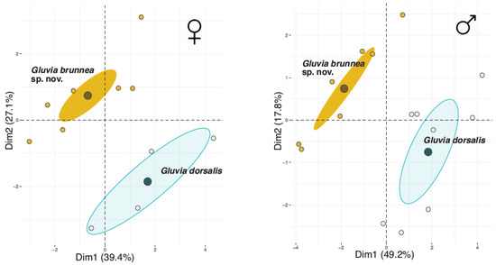 Results of multiple factor analyses (MFAs) for each sex. (Left panel) Females. (Right panel) Males. Brown dots and 95% confidence ellipses, G. brunnea sp. nov.; blue dots and 95% confidence ellipses, G. dorsalis. Larger circles correspond to the centroids of each species. The species identity was included as a supplementary categorical variable for analysis, and thus it had no effect on the ordination.