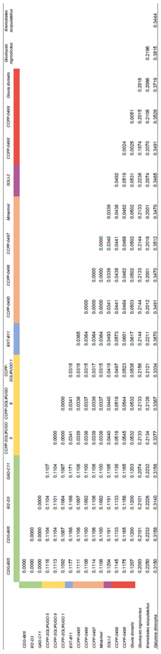 Distance matrix calculated by the Kimura 2-parameter method. The colors show groups of individuals with a distance < 0.01, corresponding to the same collection localities.