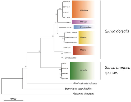 Molecular distances calculated by the Kimura two-parameter method [52] are given in Figure 7. This shows values of less than 0.005 among individuals of the same locality, which indicates a strong correspondence to geographical affinity. Distances among the different localities excluding Almería ranged from 0.0315 to 0.0573, whereas distance between individuals from Almería and those from the other localities were substantially higher, i.e., 0.1084–0.1207. The G. dorsalis sequence downloaded from GenBank showed a distance mean of 0.1202 for individuals from Almería, while this value was 0.0439 for individuals from the other localities. The distance values between the genus Gluviopsis (G. nigrocinctus) and the genus Gluvia (G. dorsalis and G. brunnea sp. nov.) were always greater than 0.2. Moreover, the distance values from other Solifugae families (E. scopulatellus-Eremobatidae family) were higher. The neighbor-joining (NJ) tree constructed with K2P distances of the different Solifugae specimens shows groups clearly separated by geographical localities and also shows the individuals from Almería in a distinct cluster, clearly separated from the other groups (Figure 8). The longer distance between individuals from Almería (G. brunnea sp. nov.) and the other specimens in the genus Gluvia is also conspicuous in the tree.