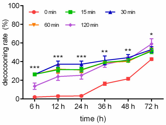 Different WI-promoted decocooning rates of O. excavata at 6, 12, 24, 36, 48, and 72 h. 0 min: control group; 15 min: WI for 15 min; 30 min: WI for 30 min; 60 min: WI for 60 min; 120 min: WI for 120 min. The difference between the control group and WI for 30 min was analyzed. Data are expressed as mean ± SEM; n = 3; * p < 0.05, ** p < 0.01, and *** p < 0.001 vs. the control group.