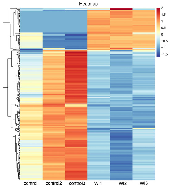 Three control samples and three WI samples were used to construct cDNA libraries and sequence the transcripts with an Illumina Novaseq™ 6000 platform. The raw reads ranged from 35,763,154 to 42,151,520, while raw bases were between 5.36 G and 6.32 G (Supplementary Table S1). The results of high-throughput sequencing identified 35,035,328, 38,226,266, and 40,595,706 valid reads in the control group and 38,569,092, 38,426,182, and 36,736,678 in the WI group. The Q20% and Q30 scores of all samples were >97.52% and >92.53%, respectively. The GC content was 41.06%–44.65%. The transcriptome data indicated that the quality of sequencing data was sufficient for subsequent analysis.