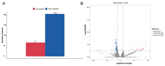 Analysis of DEGs between the WI and control groups. (A) The numbers of up-regulated (red column) and down-regulated (blue column) DEGs are summarized. (B) The volcano plot includes all DEGs. Up-regulated DEGs are indicated by red dots and down-regulated DEGs by blue dots. Non-DEGs are indicated by gray dots. The log2(fold change) values are shown on the x axis and −log10(FDR) values along the y axis. Genes with adjusted p-value ≤ 0.05 were considered differentially expressed.