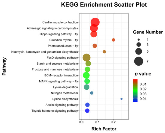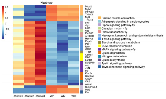 To explore the enrichment pathways of DEGs, KEGG enrichment analysis of DEGs was performed. The DEGs were significantly enriched in 16 KEGG pathways, including cardiac muscle contraction (seven, p = 1.5024 × 10−5), adrenergic signaling in cardiomyocytes (six, p = 0.0001), Hippo signaling pathway—fly (five, p = 0.0004), circadian rhythm—fly (two, p = 0.0041), phototransduction—fly (three, p = 0.0052), neomycin, kanamycin, and gentamicin biosynthesis (two, p = 0.0081), FoxO signaling pathway (six, p = 0.0105), starch and sucrose metabolism (four, p = 0.0137), fructose and mannose metabolism (four, p = 0.0204), ECM–receptor interaction (five, p = 0.0233), MAPK signaling pathway—fly (four, p = 0.0252), lysine degradation (four, p = 0.0330), nitrogen metabolism (two, p = 0.0371), lysine biosynthesis (one, p =0.0388), apelin signaling pathway (three, p = 0.0441), and thyroid hormone signaling pathway (three, p = 0.0469) (Figure 5 and Supplementary Table S4). Cluster analysis was performed on the DEGs in 16 significantly enriched KEGG pathways (Figure 6). The hierarchical clustering heat map showed that DEGs in cardiac muscle contraction, adrenergic signaling in cardiomyocytes, apelin signaling pathway, and thyroid hormone signaling pathway were up-regulated in response to WI-promoted O. excavata decocooning. However, the DEGs in the Hippo signaling pathway, FoxO signaling pathway, MAPK signaling pathway, and other pathways were down-regulated.
