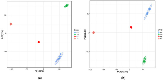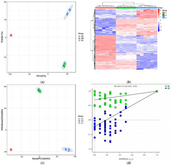 Principal component analysis (PCA) is an unsupervised data analysis method that transforms a multi-dimensional variable system into a low-dimensional one, achieving higher accuracy and reflecting the variations between sample groups and within groups [66]. The contribution rates of the first and second principal components (PC1 and PC2) were calculated as 47.0% and 24.7% after the PCA based on UPLC-MS/MS data, respectively (Figure 4a). Their cumulative contribution rate reached 71.47%, indicating that they could represent the main metabolic substances in the three samples. At the same time, the distance between the three samples was far, and there was good polymerization between the six biological replicates of the same sample, indicating that PCA can effectively distinguish the three samples. However, the polymerization effect of OL was significantly worse than that of EL and ML, indicating that the reproducibility of OL was relatively poor. Similar results could be seen from the cluster heatmaps (Figure 4b) where the three RPW larvae were well clustered within the group, and the differences in the relative amounts of each metabolite in the three samples are clearly shown.
