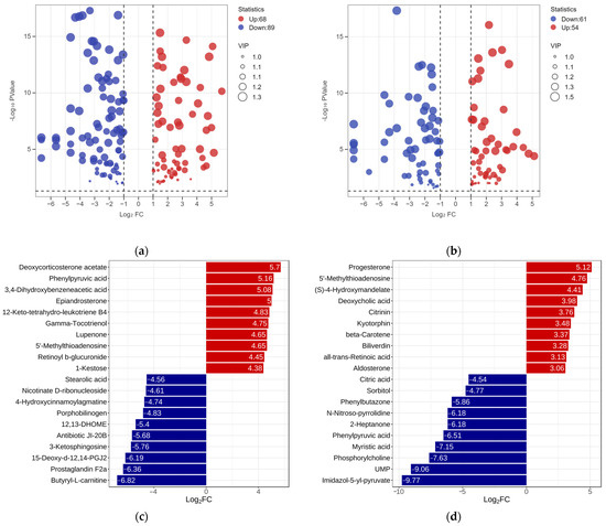 The volcano plot of differential metabolites between the (a) ML vs. EL group and (b) OL vs. ML group. Bar graph of the difference multiples between the (c) ML vs. EL group and (d) OL vs. ML group.