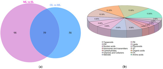 (a) Venn diagram of differential metabolites; (b) percentage pie chart of metabolite classification.