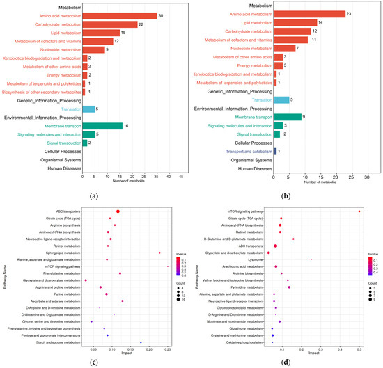 All differential metabolites from the two comparison groups were matched against the KEGG database to obtain information on the pathways in which metabolites were involved. Enrichment analysis was performed on the annotated results to identify pathways with a high concentration of differential metabolites (Figure 7a,b). The KEGG annotation results showed that differential metabolites in the ML vs. EL group and the OL vs. ML group were annotated to 56 and 57 metabolic pathways, respectively. The amino acid metabolic pathway had the highest annotation count, which was followed by the carbohydrate metabolic pathway, the lipid metabolic pathway, and the metabolism of cofactors and vitamins. As shown in Figure 7c, the differential metabolites between the ML vs. EL group were significantly enriched in ABC transporters, which was followed by the citrate cycle (TCA cycle), arginine biosynthesis, aminoacyl-tRNA biosynthesis, and neuroactive ligand–receptor interaction.