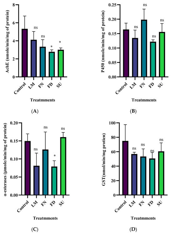 Specific activity of (A) AchE, (B) P450, (C) α-esterase, and (D) GST in Bemisia tabaci adults 48 h after treatment with lemongrass essential oil (EO), flometoquin (FN), flonicamid (FD), and sulfoxaflor (SU) at their LC50 values, compared with the control group. Dunnett’s multiple comparison test was performed, with the data expressed as mean ± S.D. * Indicates p < 0.05, ns: non-significant).