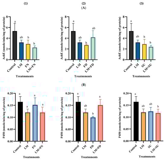 As shown in Figure 2, AchE-specific activity was significantly inhibited by the LC25 of flometoquin, flonicamid, and sulfoxaflor, when administered individually, as well as by the binary mixtures of lemongrass/flometoquin (F (3,8) = 7.39, p ≤ 5) and lemongrass/sulfoxaflor (F (3,8) = 6.48, p ≤ 5). P450-specific activity was significantly inhibited by the LC25 of flonicamid alone (F (3,8) = 8.23, p ≤ 5), and by the binary mixture of lemongrass/sulfoxaflor (F (3,8) = 4.74, p ≤ 5) (see ANOVA Table S3 in the Supplementary Materials).