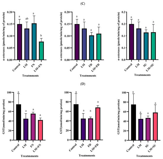 α-esterase-specific activity was significantly inhibited only by the binary mixture of lemongrass/flometoquin (F (3,8) = 6.45, p ≤ 5). On the other hand, there was no significant observed difference in GST-specific activity between either the individual insecticides or their binary mixtures with lemongrass EO, compared to the control group (Figure 2).