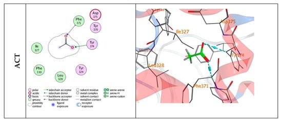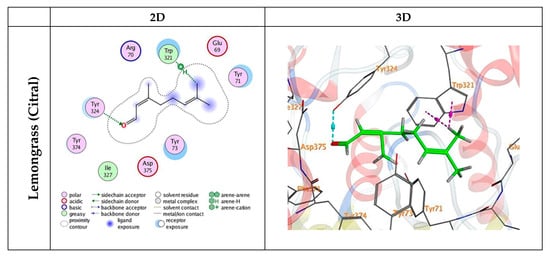 The docking process of the tested compounds was validated by running the docking procedure for the co-crystallized ligand ACT (acetate ion) against the active site of the pocket. The tested compounds gave good energy scores ranging from (S) = −4.69 to −7.06 kcal/mol (Table 3). The proposed binding pattern of citral, the major bioactive component of lemongrass EO, revealed one hydrogen bond with the amino acid residue TYR 324 and two H–arene contacts with TRP 321 (Figure 3). The interaction between flometoquin and AChE enzyme was stabilized through one hydrogen bond with TYR 73, an arene–H interaction with the residue TYR 324, and pi–pi stacking with TYR 71 amino acid (Figure 3). Flonicamid combined with the receptor through one hydrogen bond with LEU 328 and an arene–H contact with TYR 324 amino acid (Figure 3). Sulfoxaflor showed one hydrogen bond with PHE 371 amino acid and H–arene interaction with the residue TYR 324 (Figure 3). ACT had an energy score (S) = −3.41 kcal/mol and produced two H-bonds with PHE 371 and TYR 374 amino acids (Figure 3).
