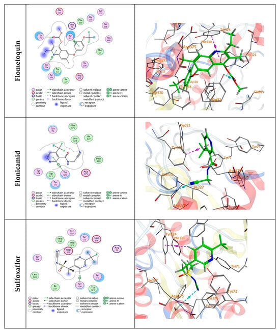 Furthermore, flometoquin, according to the IRAC, is categorized as a mitochondrial complex III electron transport inhibitor, while flonicamid is identified as a chordotonal organ nicotinamidase inhibitor. Despite their disparate target sites relative to sulfoxaflor, which is deemed a nicotinic acetylcholine receptor (nAChR) competitive modulator, they exhibited high binding affinity to AChE. The elevated binding affinity of flometoquin and flonicamid to AChE suggests that AChE might play a critical role in the toxic action of these compounds on B. tabaci. To the authors’ knowledge, this is the first molecular docking study of flometoquin and flonicamid insecticides against the active site of the AChE enzyme. However, further molecular studies are necessary to elucidate the relationship between the toxic actions of flometoquin and flonicamid and their potential inhibitory effects on AChE.