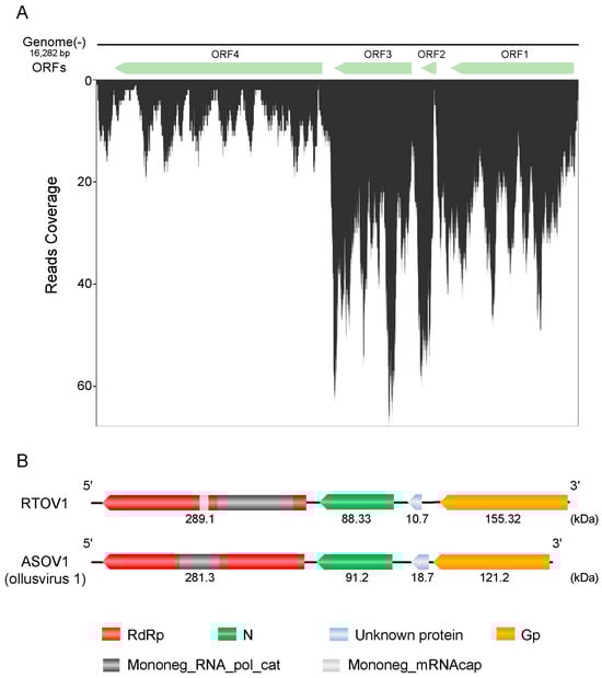 RTOV1 shared 21.61% identity in the capsid protein (CP, also named nucleoprotein in NSVs) region with its closest homologue, ollusvirus 1 (ASOV1, GenBank: WAB51682.1), meeting the delimitation criterion for establishing a new species (less than 90% CP identity). The abundance and coverage of RTOV1 were assessed by realigning RNA-seq reads with the full genome sequence of RTOV1 obtained. A total of 22,701,157 reads were perfectly aligned to the RTOV1 genome, representing 0.0048% of the total RNA-seq reads (Figure 1A). As shown in Figure 1A, the transcripts were distributed across the viral genome, with a particularly high level of abundance at the 3′ terminus, indicating that RTOV1 efficiently replicated in the insects.