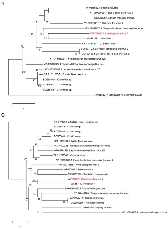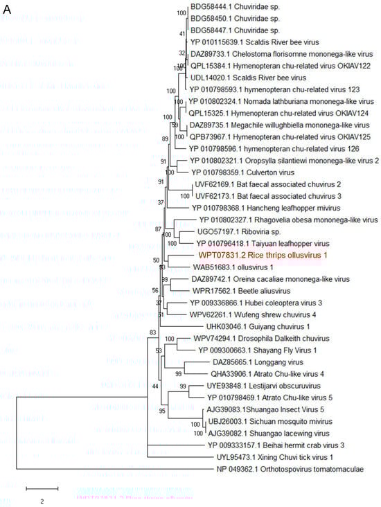 Many RNA viruses have been discovered through the application of HTS and sophisticated bioinformatics techniques, leading to an enhanced comprehension of insect viromes and the evolutionary dynamics of viruses. As an important agricultural pest, thrips can transmit multiple viruses, leading to the occurrence of viral diseases. Western flower thrips, Frankliniella occidentalis Pergande, primarily cause the spread of viruses belonging to the genus Orthotospovirus (e.g., Tomato spotted wilt virus and Tomato chlorotic spot virus) and Tobacco streak virus (TSV; genus Ilarvirus) [32,33]. Thrips palm Karny can cause the harm of viruses like Watermelon silver mottle virus (WSMoV; genus Orthotospovirus), Peanut bud necrosis virus (PBNV; genus Orthotospovirus) and Muskmelon yellow spot virus (MYSV; genus Orthotospovirus) [34,35]. Thrips tabaci Lindeman play a crucial role in the prevalence of diseases, such as Tobacco ringspot virus (TRSV; genus Nepovirus, family Secoviridae), Sowbane mosaic virus (SoMV; genus Sobemovirus) and Iris yellow spot virus (IYSV; genus Orthotospovirus) [36,37,38]. All the thrips species that transmit plant viruses belong to the family Thripidae and the subfamily Thripinae. In this paper, we identified a new virus belonging to the genus Ollusvirus in family Phlaeothripidae and named it RTOV1. At present, 15 species of thrips have been confirmed to transmit viruses, accounting for just 0.2% of the total number of recorded thrips species [39]. In the future, investigating its virulence in the host, host range, and potential transmission to rice would not only deepen our understanding of the diversity and evolution of ISVs in insects, but also have significant implications for pest management strategies. Additionally, this would help uncover the potential reasons behind the damage caused to rice by thrip species.