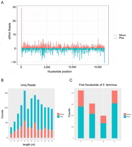 RNA silencing serves as a crucial antiviral immune response in insects, playing a significant role in the elimination of viruses [29,30]. Viral dsRNA is cleaved by the insect RNase III enzyme Dicer-2 (Dcr2), and subsequently generates large amounts of virus-derived siRNAs (vsiRNAs) in the host [31]. To investigate siRNA-based antiviral immunity in response to the RTOV1 infection of H. aculeatus, small RNAs (sRNAs) of the host insect were sequenced, and the vsiRNAs were comprehensively analysed. A total of 2,699,871 vsiRNA reads, including 1350 unique reads, were perfectly mapped to the assembled RTOV1 genome sequence (Figure 3A). Of these vsiRNAs, more were derived from the positive-sense strand than from the negative-sense strand of the viral genome (Figure 3B). To provide further analyses of the types of these vsiRNAs, it was shown that vsiRNAs from the viral positive-sense strand of the viral genome were predominantly 22 nt in length (Figure 3B).