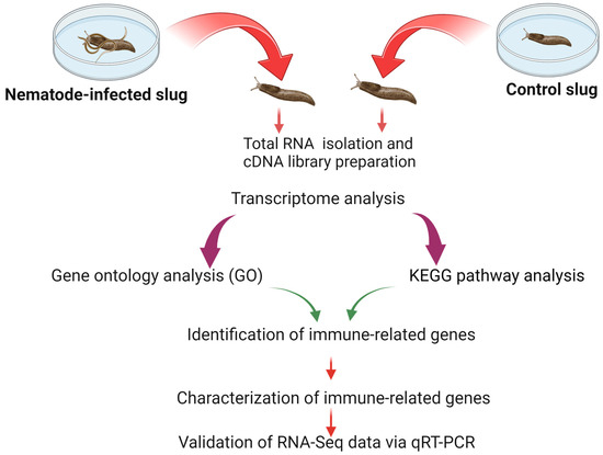 Outline of the experimental procedure of RNA transcriptome analysis and identification of genes associated with immunity and its pathways from nematode-infected and uninfected slugs.
