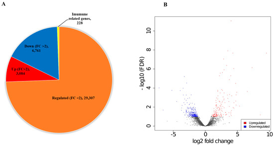To explore the changes in the gene expression of D. reticulatum infected with pathogenic nematodes (nematode-infected slug), a pairwise comparison was performed between the nematode-infected and the control slug libraries to determine the differentially expressed genes (DEGs). The screening threshold for DEGs in the infected slugs compared to the control slugs was set as genes having a fold-change greater than 1 and false discovery rate (FDR) value less than 0.001. Compared to the slug–control treatment, of the total 39,380 regulated unigenes, 29,307 genes (74.4%) had FC < 2. Among FC > 2 genes, 3084 (7.8%) were upregulated and 6761 (17.2%) were downregulated. We found 228 genes that were annotated to immunity or related pathways in the slug–nematode (Figure 2A). Volcano plots of DEGs were similar to the distribution of gene expression (FC > 2) of all DEGs in the nematode-infected slug compared (Figure 2B).