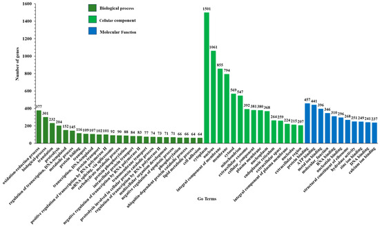 Gene ontology (GO)-enriched terms of differentially expressed genes (DEGs) of Deroceras reticulatum after infection with nematode. The x-axis lists the sub-GO terms under categories of biological process, cellular component, and molecular function. The y-axis is the number of DEGs involved in each term.