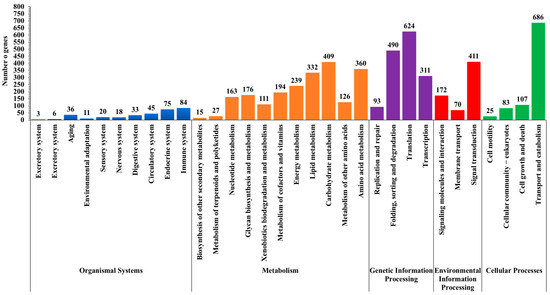 Furthermore, we classified the unigenes in the Kyoto Encyclopedia of Genes and Genomes (KEGG) database and assigned them to five biological pathways: 2152 unigenes (39.0%) in metabolism, followed by 1518 unigenes (27.5%) in genetic information processing, 901 unigenes (16.3%) in cellular processes, 653 unigenes (11.8%) in environmental information processing and 331 unigenes (0.06%) in organismal systems (Figure 4). Within the total of 2152 metabolism genes, there were 409 unigenes (19.0%) for carbohydrates, 360 unigenes (16.7%) for amino acids, and 332 unigenes (15.4%) for lipids. Similarly, the second largest group, genetic information processing (1518 genes), were involved in translation with 624 (29%) followed by folding, sorting, and degradation 490 (22.8%), and transcription 311 (14.5%). Of genes involved in pathways of the organismal systems, most were in the immune system (84 unigenes) and the endocrine system (75 unigenes) (Figure 4).