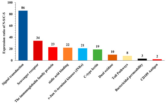 The total number of genes associated with immunity and immune-related pathways in the nematode-infected slug (N-S) compared to the uninfected control slug (C-S) group. To increase the reliability of the results, genes annotated as hypothetical or unknown and genes with log2 fold change < 1 were filtered out.