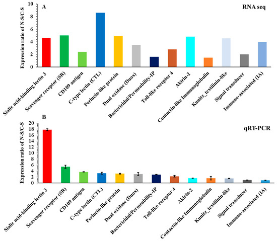 From the RNA-seq results, we selected 13 immune-related genes that showed high levels of differential expression (FC > 2) in the nematode-infected slug (N-S) compared to the control slug (C-S) (Figure 6A). To validate the relative mRNA expression, qRT-PCR was performed to determine the relative gene expression ratios in the nematode-infected slugs and control slugs (Figure 6B). All selected genes were detected, and the relative expression ratios measured by qRT-PCR were slightly different from the RNA-seq results (Figure 6B). For example, the relative mRNA expression ratio of the C-type lectin gene was the highest from the RNA seq, but the sialic acid-binding lectin 3 gene had the highest expression ratio based on the qRT-PCR results, but the others were similarly expressed based on the qRT-PCR results.