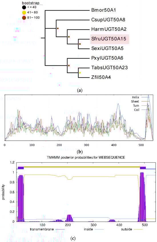 Bioinformatics analysis of SfUGT50A15. (a) Phylogenetic analysis of SfUGT50A15 protein and its homologs. Bmor-Bombyx mori, Csup-Chilo suppressalis, Harm-Helicoverpa armigera, Sfru-S. frugiperda, Sexi-Spodoptera exigua, Pxyl-Plutella xylostella, Tabs-Tuta absoluta, Zfil-Zygaena filipendulae. (b) SfUGT50A15 secondary structure prediction peaks. Blue: alpha helix, green: beta turn, yellow: random coil, red: extended strand. (c) Predicted transmembrane domains of SfUGT50A15 protein.