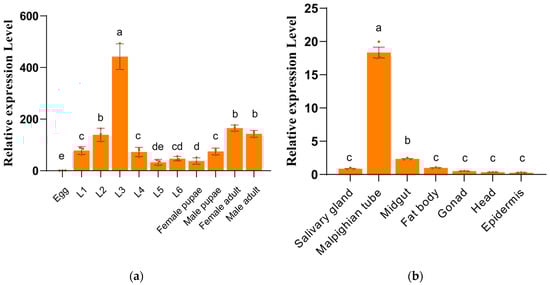 We employed quantitative real-time PCR to examine the expression pattern of SfUGT50A15 across various developmental stages and tissue types. The mRNA levels of SfUGT50A15 increased gradually from the egg stage to the third-instar larvae, were reduced from the third to the sixth instar, and significantly increased following the pupal stage in adult females (Figure 2a). In the tissue expression profile of the larvae, SfUGT50A15 expression was highest in the Malpighian tube (Figure 2b).