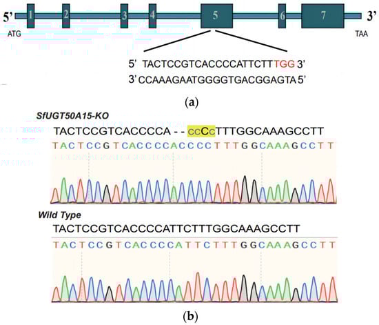 Schematic representation of the SfUGT50A15 knockout. (a) Target location of sgRNA. The SfUGT50A15 gene has seven exons and the sgRNA was designed to be in exon 5; the target sequence is shown below the fold. (b) Representative sequencing chromatograms of PCR products from wild-type (WT) and G0 injected eggs. Sequences determined by TA clone sequencing are shown at the top of the image. In the mutant sequence SfUGT50A15-KO, the deletion is shown as a dash, the insertion as a blue lowercase letter, and the yellow shading as the mutated region, totaling 2 bp for the deletion and 3 bp for the insertion.
