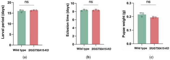 A statistical analysis was conducted on the biological characteristics of homozygous knockout strains of S. frugiperda SfUGT50A15. The results revealed no significant differences between the SfUGT50A15 knockout homozygous strains and the wild-type strain in terms of larval duration, eclosion time, pupal weight, adult lifespan, adult oviposition quantity, and egg hatching rate. These findings suggest that SfUGT50A15 may not be involved in the growth and development of S. frugiperda, or its deletion may have led to the compensatory upregulation of other growth-regulating genes [46,47]. Further research is needed to elucidate the specific regulatory mechanisms.