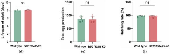 We examined the cost of the adaptation of the SfUGT50A15 knockout strain. As a result, there were no significant differences in the larval period, eclosion time, pupae weight, adult lifespan, fecundity, or egg hatching rate between the two genotypes (Figure 4).