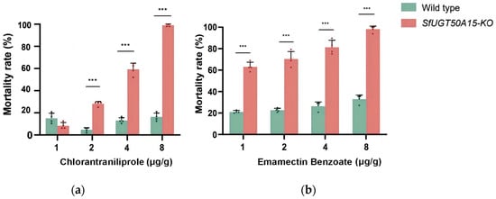 Mortality of wild-type S. frugiperda and SfUGT50A15 knockout strain at different concentrations of (a) chlorantraniliprole and (b) emamectin benzoate. ***, p < 0.001.