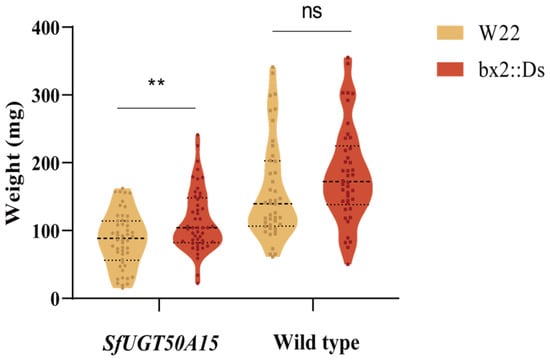 Body weight of S. frugiperda larvae after feeding for 7 days on W22 and BX2 strains of maize. **, p < 0.01. ns, not significant.