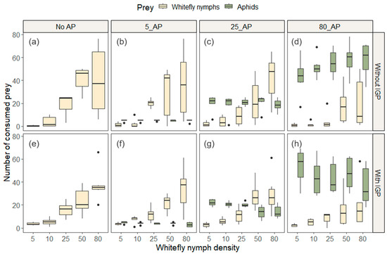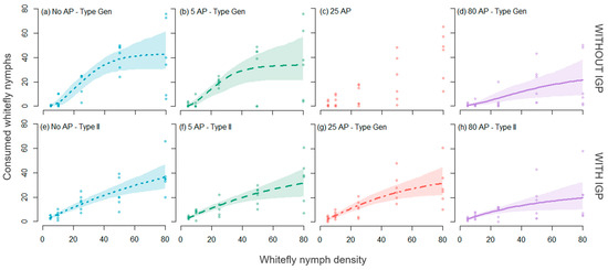 Generalized linear models (GLMs) were conducted to compare the number of consumed whitefly nymphs and aphids (AP) offered to G. punctipes for Experiments 1 and 2 (without and with IGP). The number of consumed whitefly nymphs (FP) and the number of consumed aphids (AP) were used as dependent variables. The independent variable was the whitefly density (5, 10, 25, 50, and 80 whitefly nymphs) for each AP treatment (No AP, 5_AP, 25_AP, and 80_AP) in the two experiments, without and with IGP (parasitized nymphs). Different families and link functions were tested to select the best model fit for each AP treatment. The results can be found in Table S1.