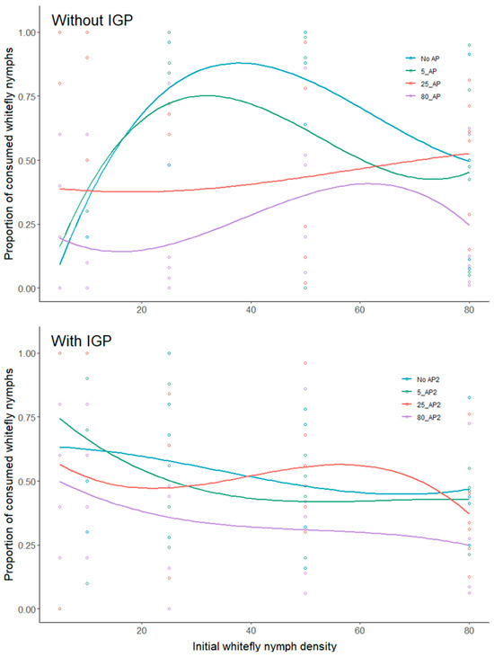 We conclude that the theoretical prediction that AP will modify the predator’s functional response holds only in a complex context of predator–prey interactions (i.e., with IGP) and under particular circumstances (e.g., when given 25 aphids). Then, it is essential to highlight that the theoretical prediction will not always occur, since the predator will probably be able to respond based not only on the abundance of the AP but also on the characteristics (i.e., quality, mobility, and species) of the prey. While the AP did not alter the type of functional response in our experiment with non-parasitized whitefly nymphs (without IGP), it did influence both the magnitude of the response and the quantity of FP consumed. From a biological control point of view, our results indicate that the control exerted by the predator G. punctipes on non-parasitized whitefly nymphs could decrease as the AP (aphids) density increases. Furthermore, in parasitized whitefly nymphs, the AP could disrupt population dynamics by changing the functional response from hyperbolic to sigmoidal [68].