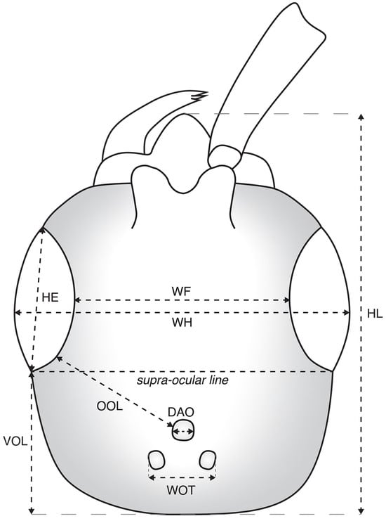 Schematic line drawing of a fictitious bethylid wasp head with indication of measurements used in the present study.