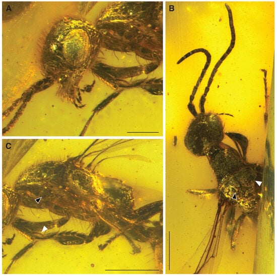 Hukawngepyris setosus gen. et sp. nov., female holotype, MB.I.8638, (A) head in left lateral view; (B) head and partial mesosoma in dorsal view (black arrow: notaulus; white arrow: parapsidal signum); (C) mesosoma in left lateroventral view (black arrow: propleural epicoxal sulcus; white arrow: protibial spur). Scale bars: A = 0.25 mm, B–C = 0.5 mm.