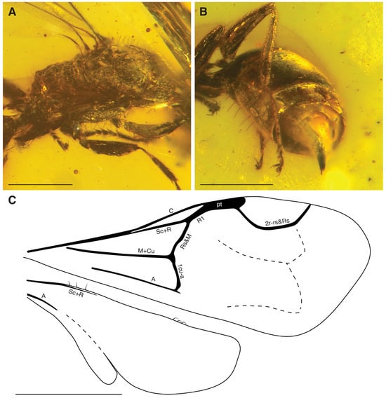 Of the five extant subfamilies, three have a fossil record that dates back to the mid-Cretaceous, i.e., the Pristocerinae [31], the Scleroderminae [32,33], and the Bethylinae [1,34]. Whereas the first two are known from specimens included in Kachin amber (although Cockerell’s attribution of the Scleroderminae specimen to this subfamily is difficult to rely on [33]), the Bethylinae are known from the Lower Cretaceous of Transbaikala (Russia). Females of the Pristocerinae are apterous, even in the fossil record, excluding this subfamily [1,31]. The Scleroderminae are generally characterized by a polished cuticle, a reduced forewing venation with C vein often absent (most complete venation found in Nothepyris Evans, 1973), the anterior wing margin angularly incurved, and the pedicel longer than the first flagellomere [1,35], precluding an assignment of our specimen to this subfamily. Our specimen displays some characteristics reminiscent of the Bethylinae, namely the 2r-rs&Rs vein reaching the anterior margin of the wing and the somewhat angled 1Rs&1M vein. However, it lacks the tubular Rs + M vein, the clypeal carina extending on the frons, and the angled tarsal claws, diagnostic for this subfamily [1]. The only bethylid subfamily that has no documented fossil record at all are the Mesitiinae, members of which have a conspicuously long second metasomal segment that is longer than all subsequent segments. The metasoma of our specimen superficially resembles that of Mesitiinae as it is contracted, with the posterior segments retracted and not entirely visible, giving the illusion that the metasomal segment 2 is much longer than the subsequent segments. This contraction, however, may be due to a muscle contraction during its embedment in amber or death, so it is likely that the metasomal segment 2 is actually not longer than the posterior segments at all.