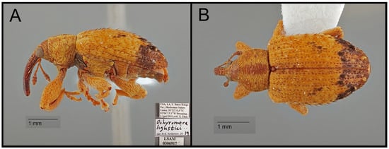 - O‘Brien, C.W.; Wibmer, G.J. Annotated checklist of the weevils (Curculionidae sensu lato) of North America, Central America, and the West Indies (Coleoptera: Curculionoidea). Mem. Am. Entomol. Soc. 1982, 34, 1–382. [Google Scholar]