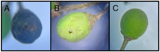 Ligustrum sinensis fruits of different conditions: (A) group i (unhealthy brown); (B) group ii (green with feeding or oviposition marks); (C) group iii (green without any feeding or oviposition marks).