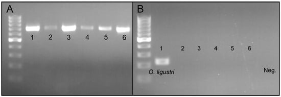 Researchers can save time in confirming the presence of O. ligustri with direct PCR or time-efficient DNA extraction methods. However, sensitivity tests should be performed when raw DNA are extracted using different isolation methods. To detect the specific DNA from a targeted organism, finding the optimal PCR conditions is important for specificity and efficiency [41]. Our gradient PCR results showed that the novel primer set visualized fairly bright bands at an annealing temperature range of 46–64 °C (Figure S4). However, we recommend the use of annealing temperatures of 55–58 °C because (a) the brightest bands were produced at 55 °C and 58 °C, (b) low annealing temperatures frequently produce non-specific bands [42], (c) band production is decreased when high annealing temperatures are used [42]. Regarding the PCR cycles, we confirmed that 40 PCR cycles produced a brighter band compared to 35 PCR cycles when 0.01 ng of DNA of O. ligustri was used. However, using more than 40 PCR cycles is undesirable due to the possibility of producing non-specific bands [43].