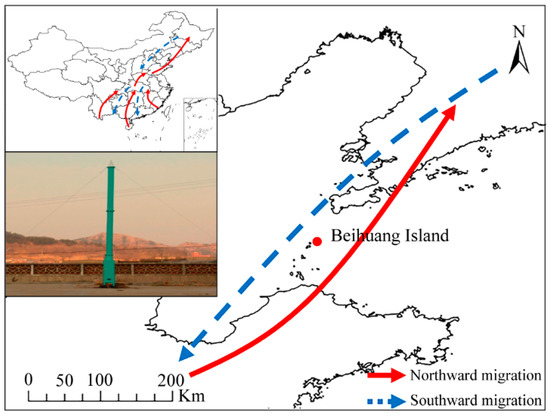 The population dynamics of green lacewing species (Ch. nipponensis, Ch. Furcifera, C. pallens, and C. formosa) were explored from 2012 to 2021 at the Field Experimental Station for Pest Monitoring and Control, Institute of Plant Protection, Chinese Academy of Agricultural Sciences (Beihuang Island, Shandong Province, 38°23′12″ N, 120°54′30″ E). This location serves as a pathway for the seasonal long-distance migration of many insect species between the northeastern region and the southern, central, and northern regions of China, with immigration occurring from May to June and emigration occurring from August to October. There is no available farmland or farming operations on this island. Northeast China is one of the main crop-producing regions in China, and the BH tract is an important route for many destructive agricultural pests and natural enemies to migrate northwards. Therefore, this island provides an excellent location for monitoring the migration of insects across the Bohai Strait (Figure 1).