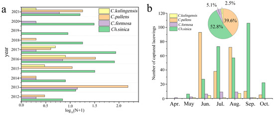 (a) The annual capture numbers and (b) the monthly capture numbers and percentages of Chrysoperla nipponensis, Chrysoperla furcifera, Chrysopa pallens, and Chrysopa formosa via the suction trap on Beihuang Island during 2012–2021.