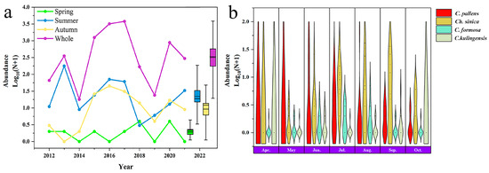 In total, 551 individuals of the four green lacewing species were captured during the decade, with an average annual catch of 55.10 ± 18.27 individuals. The greatest number of green lacewings was captured in 2013, with a total of 177 individuals. Conversely, the lowest number was captured in 2019, with only eight individuals. Among the four species, Ch. nipponensis accounted for 53.10% of the total captures, while Ch. furcifera accounted for only 2.50% (Figure 2). The number of green lacewings in spring (46.27 ± 30.12) was significantly lower than that in summer (107.98 ± 22.08) and autumn (116.46 ± 57.41) (Figure 3a). The total number of green lacewings also varied significantly among different months (F3, 24 = 3.70, p = 0.03). June had the highest average number of green lacewings (14.70 ± 7.95), which was 146 times greater than the average number in April (0.10 ± 0.10) (Figure 3b).