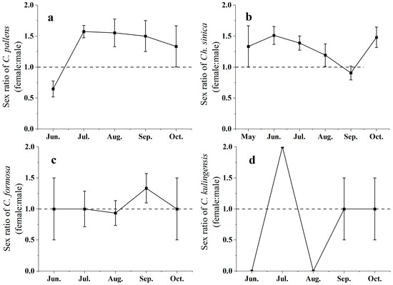 Overall, the sex ratio of green lacewings varied among different months, with more females being captured than males. The proportion of females also exhibited significant seasonal differences (F10,25 = 8.74, p < 0.05) (Figure 4). More female green lacewings than male green lacewings were captured in July. In contrast, in other months, the difference in the number of males and females was not significant (May: χ2 = 0.54, df = 1, p > 0.05; June: χ2 = 0.98, df = 1, p > 0.05; August: χ2 = 3.40, df = 1, p > 0.05; September: χ2 = 2.40, df = 1, p > 0.05; October: χ2 = 2.24, df = 1, p > 0.05). Specifically, the sex ratios of C. pallens were 32.34% ± 12.88% (June), 78.63% ± 9.93% (July), 77.53% ± 22.46% (August), 75.00% ± 25.00% (September), and 66.66% ± 33.33% (October) from June to September. In contrast, from May to October, the sex ratios of Ch. nipponensis were 66.66% ± 33.33% (May), 75.51% ± 14.44% (June), 69.36% ± 11.47% (July), 59.56% ± 18.21% (August), 45.25% ± 11.10% (September), and 74.00% ± 16.61% (October) (Supplementary Figure S4).