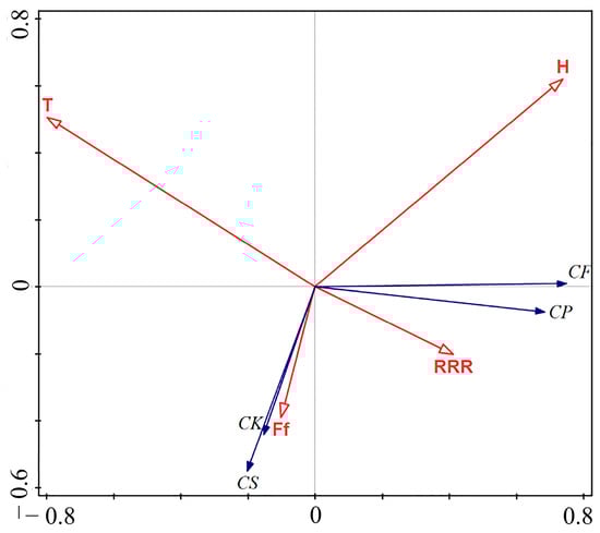 RDA biplots of the capture numbers of the four green lacewings and meteorological factors on Beihuang Island from 2012 to 2021. The smaller the angle between the vectors (or a vector and an axis) and the longer the vectors are, the more correlated the variables represented by the vectors are. All the environmental variables (with significant (solid arrows) effects on the number of green lacewings captured) are shown. Note: CS: Chrysoperla nipponensis; CK: Chrysopa furcifera; CF: Chrysopa formosa; CP: Chrysopa pallens; T: average weekly temperature; H: average weekly humidity; Ff: average weekly wind speed; RRR: average weekly rainfall.