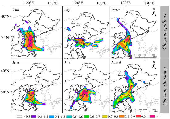 Possible source locations for two dominant species (Chrysoperla nipponensis and Chrysopa pallens) captured on Beihuang Island in different months. The different colors indicate the likelihood of the PSCF analysis results for migrating through the landing site.