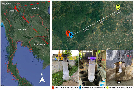 Figure 1. The location and geographic coordinates of Culicoides trapping sites in Mae Kon and Mae Yao Subdistricts, Muang District, Chiang Rai Province, Northern Thailand. The light traps were installed within the patient’s residential area (A), near the grocery shop (B), and within the hall of Tham Phra cave (C). The satellite image was modified from the Google Earth website (https://earth.google.com/web/search/Thailand (accessed on 15 July 2023)).